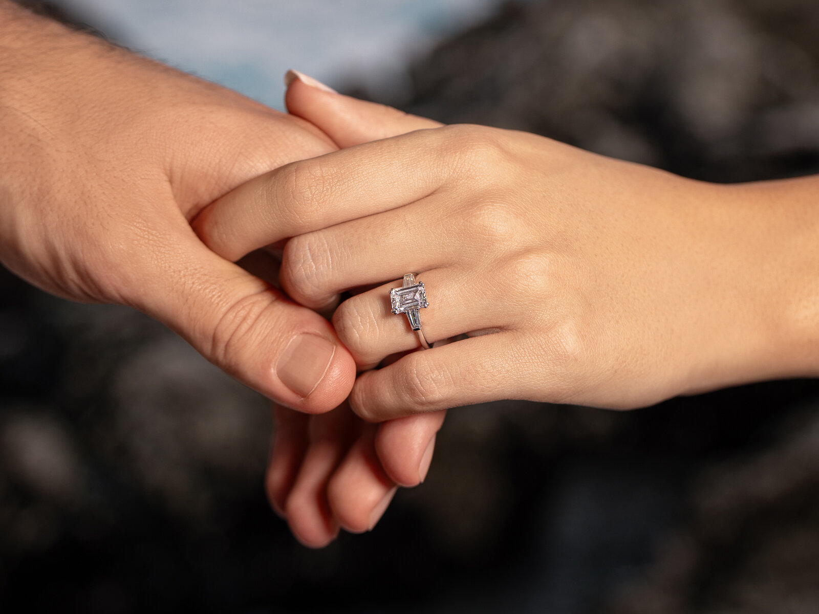 Een evenwichtige verhouding tussen lengte en breedte in de middensteen en de fonkelende baguette diamanten draagt bij tot de bijzondere charme van deze verlovingsring.