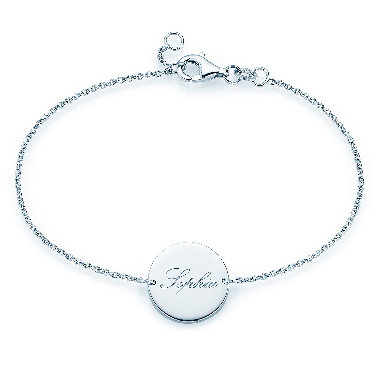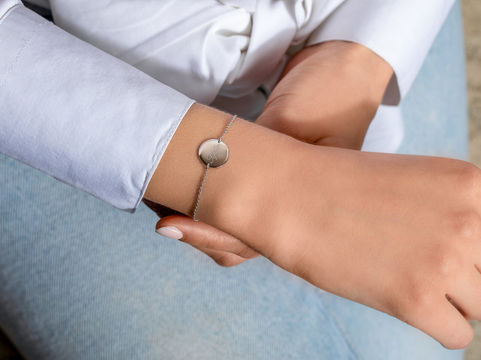 Een armband met een rond gegraveerd plaatje - symbool van zonneschijn en levensvreugde. Dit betoverende sieraad is populair bij mensen die de initialen van hun kind of partner altijd bij zich willen hebben. Een prachtig cadeau voor verjaardagen, jubilea en feestelijke gelegenheden.