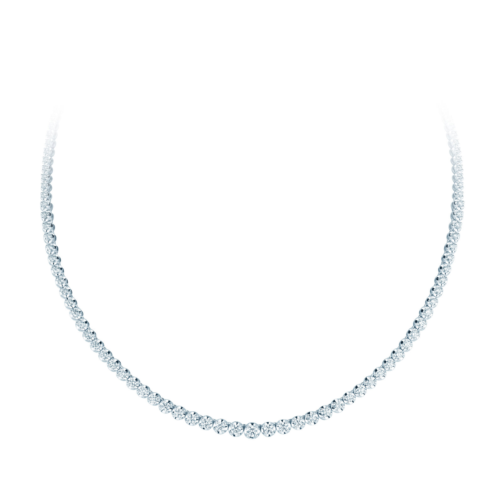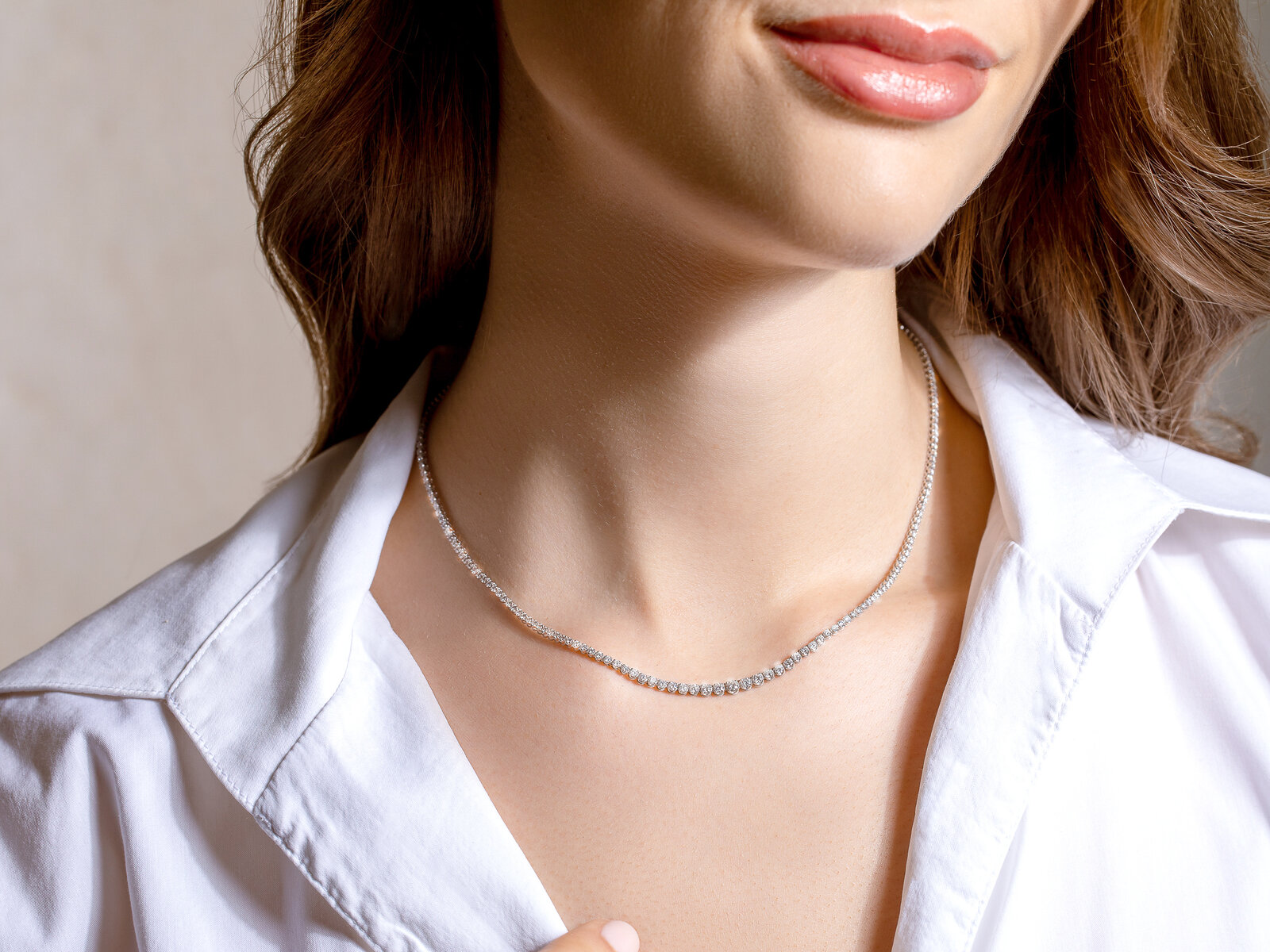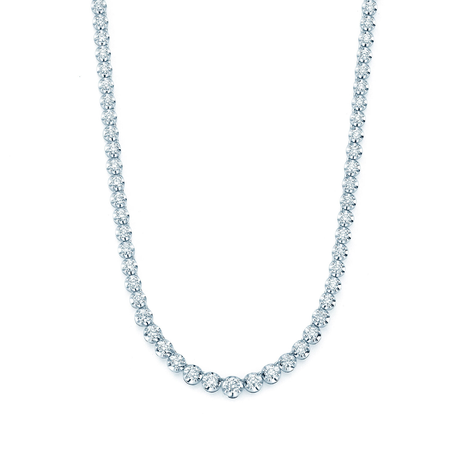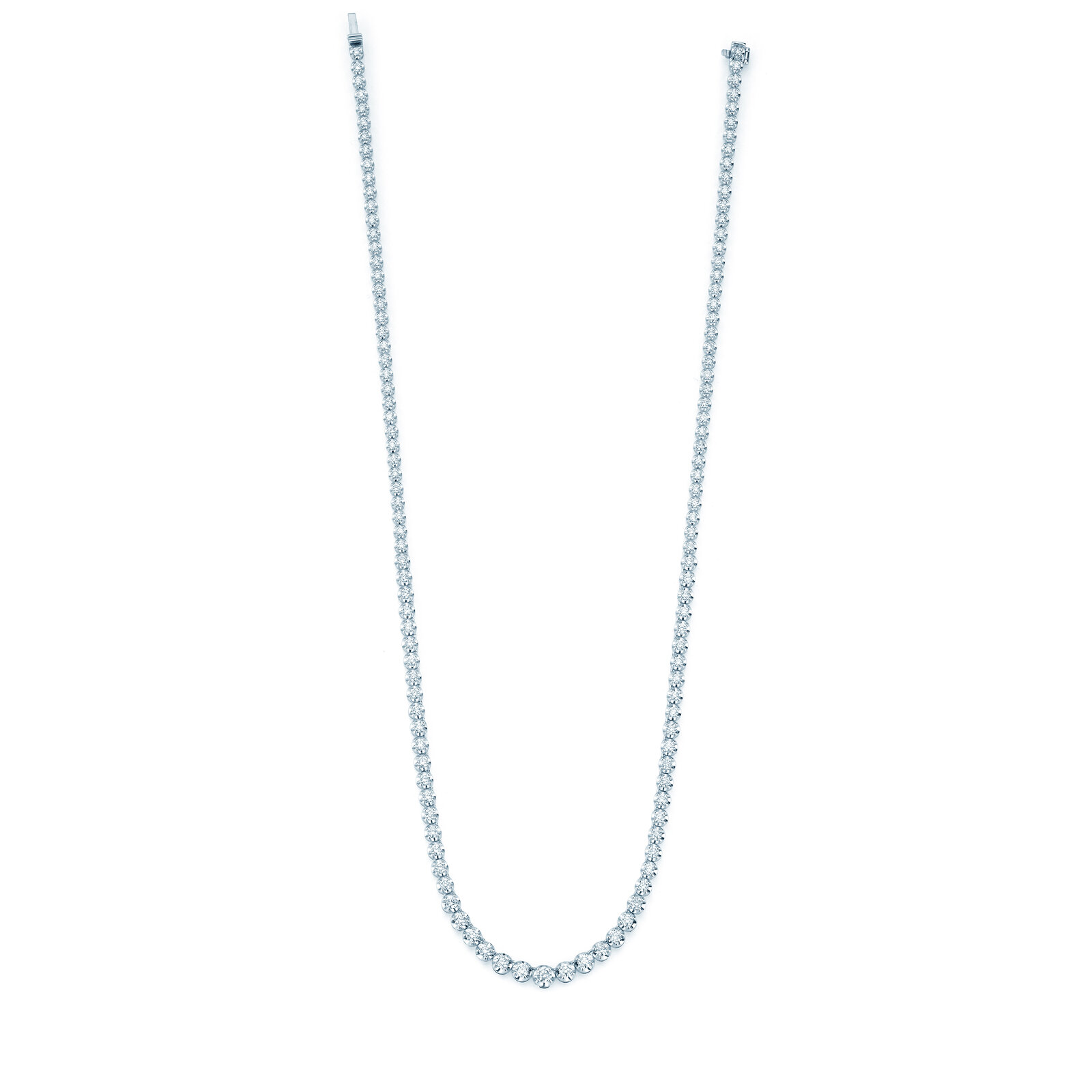 De klassieke tenniscollier is volledig bezet met diamanten die naar het midden toe steeds groter worden.