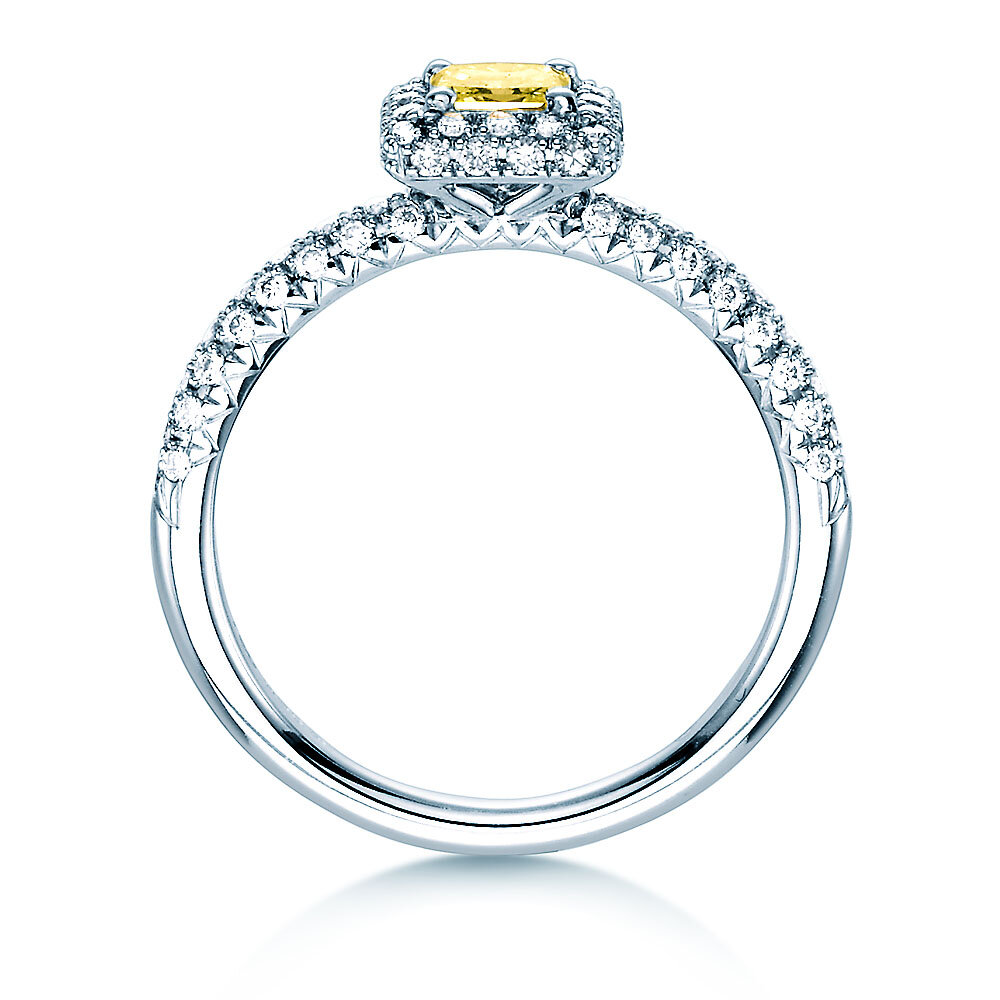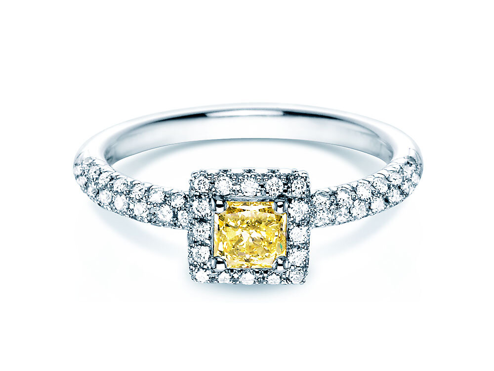 Tegenpolen trekken elkaar aan. De expressieve vierkante gele prinses geslepen diamant wordt omringd door de witte diamanten. Een uitstekende ring voor een vrouw met een expressieve charme.